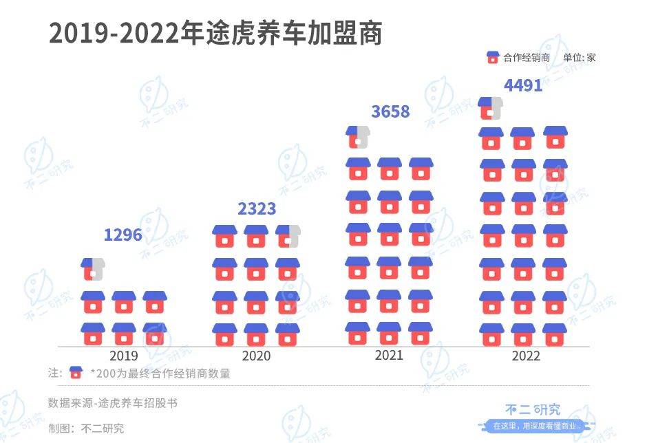 在平臺服務收入方面,2019-2022年,途虎養車的加盟商分別為1296家、2323家、3658家和4491家,平均每家門店加盟費在1萬-4萬元之間。