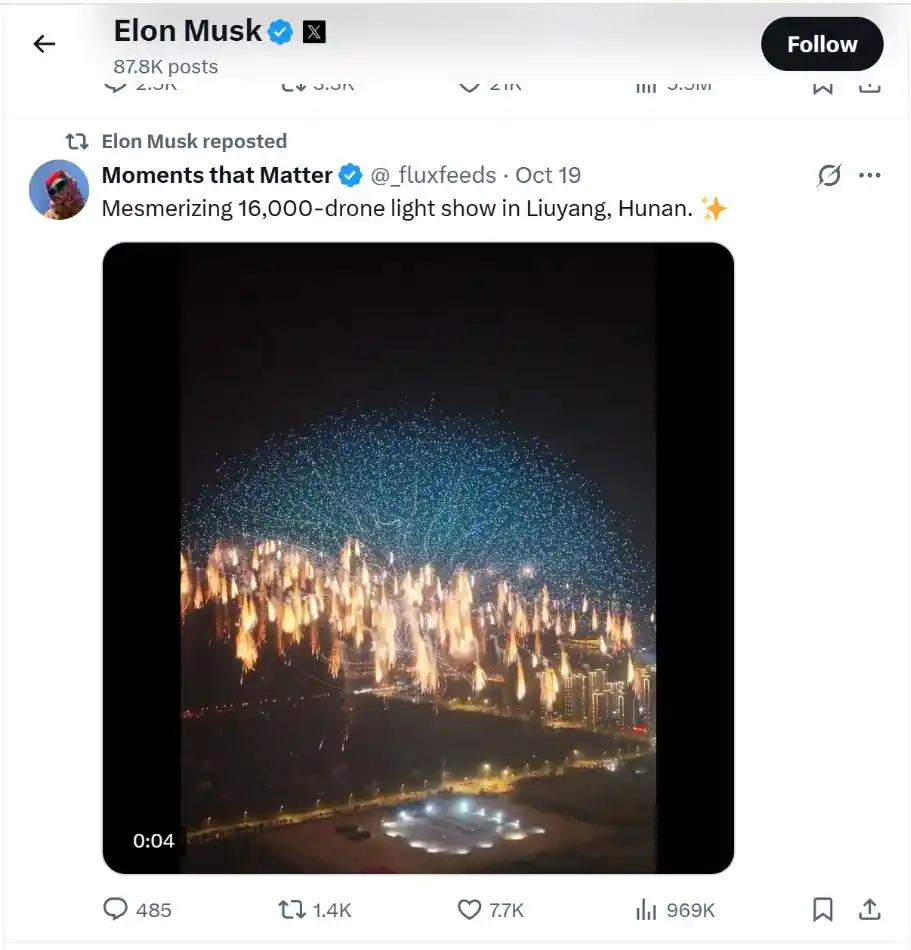 瀏陽無人機煙花秀在海外同樣引發關注。19日,特斯拉創始人埃隆?馬斯克在社交平臺上轉發“瀏陽創意煙花與無人機共舞破吉尼斯世界紀錄”的新聞,引發海外網友熱議。