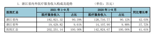 從財報展示的數據來看,截至2021年上半年末,通策醫療已有營業口腔醫療機構50 余家,位居浙江省內的38家;今年1-9月,浙江省內醫院共為通策醫療貢獻了18.28億元的醫療服務收入,占比超過90%,門診人次占到總人次的86.87%。