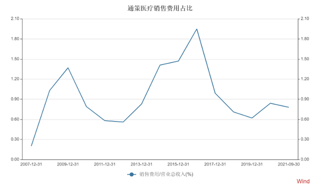 據節點財經整理,上市至今,通策醫療的銷售費用率一直穩定在2%以內,今年前三季度僅為0.78%;2018-2020年,公司主營業務毛利率高達43.14%、45.93%及45.05%。 負債端,2015年至2020年,通策醫療資產負債比率整體呈下降趨勢,截至2020末,公司資產負債率約為24.39%,距離貴州茅臺僅差2.99個百分點。