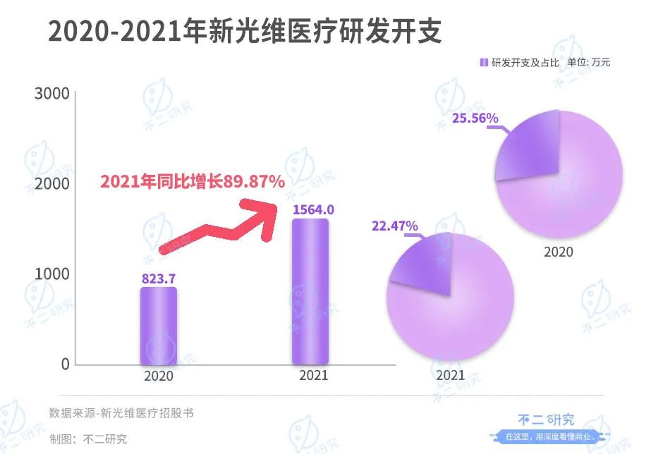 最后看研發開支,據新光維醫療招股書顯示,其2020及2021年研發開支分別為823.7萬元和1564.0萬元,2021年同比增長89.87%。2020和2021年的研發開支分別占其營收比例為25.56%和22.47%。