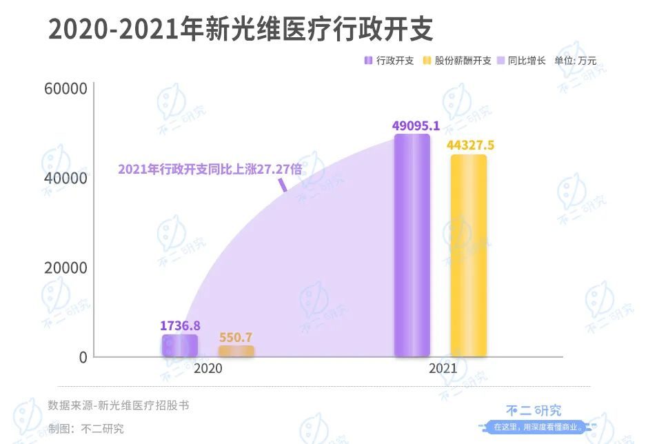 再看行政開支,據其招股書顯示,新光維醫療2020及2021年的行政開支分別為1736.8萬元和49095.1萬元,2021年行政開支同比上漲27.27倍。行政費用上漲如此之多的主要原因在于新光維醫療的股份薪酬開支從2020年的550.7萬元增至44327.5萬元,此項開支對于上市前企業并不罕見,在上市前進行對員工授予股權以此激勵員工。