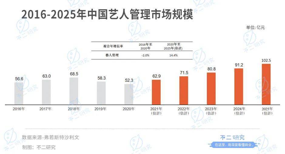 由于疫情影響,2019年中國藝人管理市場的規模開始呈走低趨勢,由2018年的685億元降至2019年的583億元,2020年再降至523億元。雖然在往后幾年預計會有回升,但是疫情加之限薪令的影響,未來是否會有新的變化尚未可知。