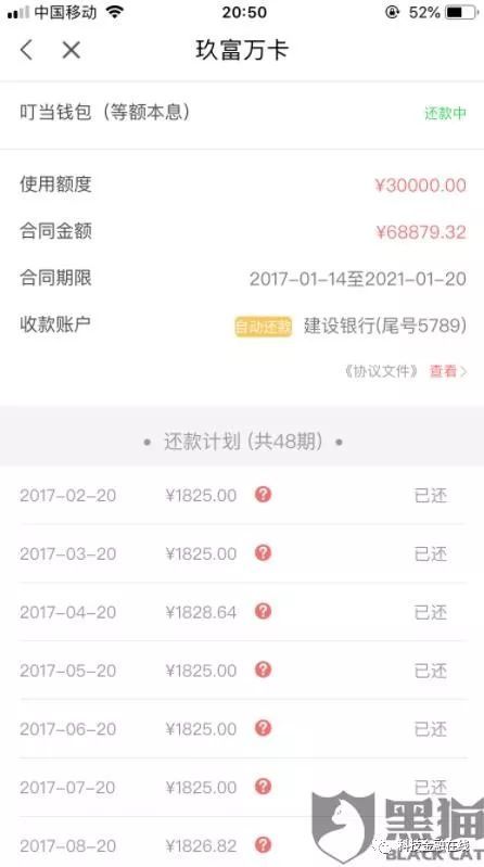 據(jù)黑貓投訴平臺(tái)上的一位蔣先生表示,自己于2017年1月4號(hào)在玖富萬(wàn)卡平臺(tái)辦理了一筆3萬(wàn)元的貸款,合同約定每期還款1825元,共分48期。蔣先生表示,這筆欠款他已經(jīng)還了2年多,總共還款金額已經(jīng)有45625元。可根據(jù)賬單,他還要再還款2年。“3萬(wàn)的本金,利息和手續(xù)費(fèi)加起來(lái)超過(guò)了5萬(wàn),而且一旦不還錢就會(huì)被他們暴力催收。出于無(wú)奈,我只能繼續(xù)在他們那里貸款,以貸養(yǎng)貸。”