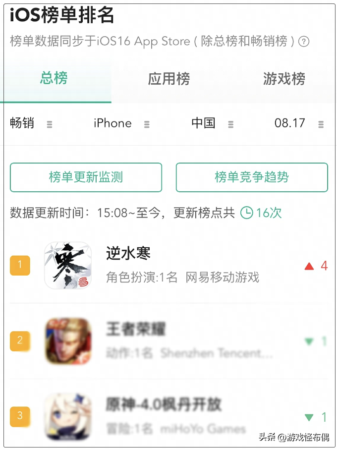 8月17日,網易武俠開放世界手游《逆水寒》,憑借一次周更的系列皮膚,就把騰訊長期霸榜的手游一哥《王者榮耀》踩在腳下,剛剛更新4.0的《原神》只能屈居第三。