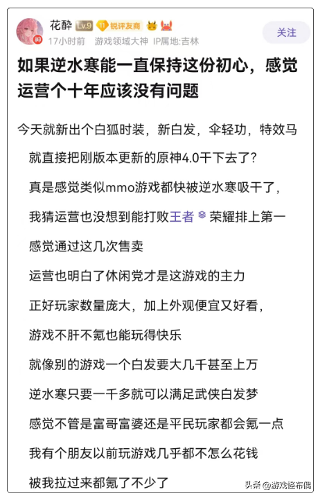 還有從別的MMO轉戰而來的玩家稱:“自從玩《逆水寒》手游就懶得上XX了,這邊衣服不僅漂亮還便宜,策劃還能根據玩家意見修改白狐設計,只能選擇留下。”
