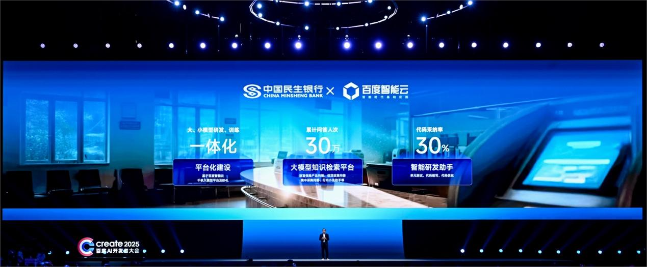 從模型服務到應用開發,企業客戶已經在千帆平臺上做出了很多行業創新。民生銀行與百度智能云合作,探索大模型在商業銀行的落地,完成了金融領域第一個端到端涵蓋算力、平臺、模型、應用四層架構的項目落地。