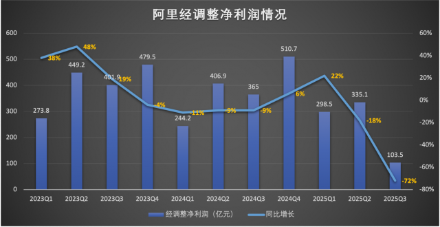 不過,由于對即時零售、用戶體驗以及科技的投入,阿里經營利潤同比下降85%,經調整凈利潤下降72%。