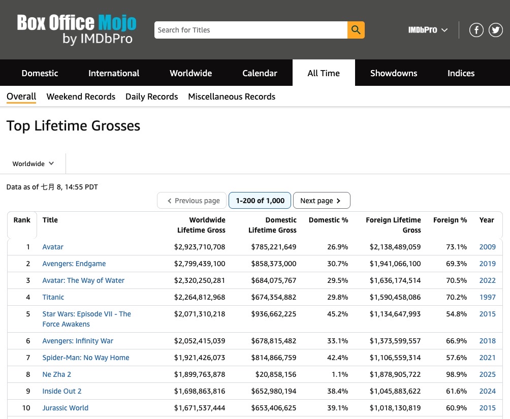 經TechWeb證實,《哪吒2》依然在該平臺的票房排行榜當中,目前位列全球影史票房榜第8位;2025年暫列全球總票房冠軍。