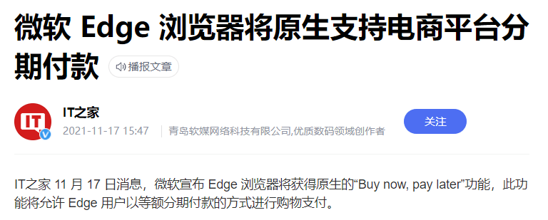 像是微軟也就早和 Quadpay 合作,在自帶瀏覽器上集成了 BNPL 功能。