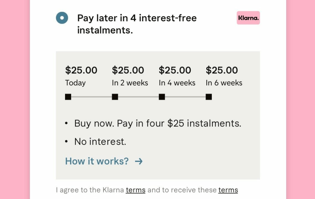 就拿 Klarna 平臺為例子,提交完個人資料,獲取額度之后,在支持的商家直接選擇分期就行。