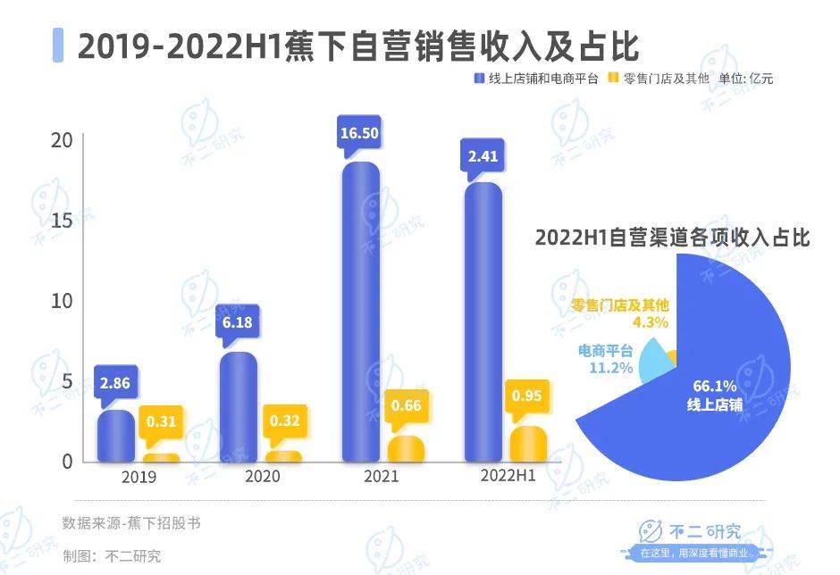 2019-2022上半年,蕉下線上店鋪和電商平臺產生的收入分別為2.86億元、6.18億元、19.47億元和17.08億元;通過零售門店及其他(主要包括向擁有成熟零售網絡的大客戶銷售)產生的收入則分別為0.31億元、0.32億元、0.66億元和0.95億元。