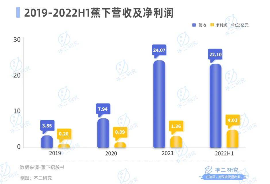 「不二研究」據其招股書發現:2022上半年,蕉下營收22.10億元,同比增加81.3%;同期,經調整后的凈利潤為4.03億元,同比增加196.32%。