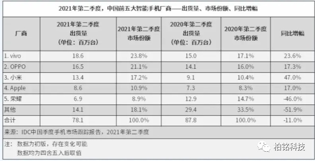 國內手機市場第一名至第四名分別為vivo、OPPO、小米、蘋果,它們同樣受益于華為手機的大幅衰退,出貨量分別同比增長23.6%、17.3%、47.0%、17.0%,顯然小米從華為手機的衰退中獲益最大。 華為手機曾在國內手機市場占有超過四成的市場份額,居于國內手機市場第一名,不過從2020年9月15日起臺積電等芯片代工企業就無法再為華為代工生產芯片,高通、聯發科也不能為華為供應芯片,由此華為手機的出貨量迅速下滑。2020年Q4華為手機還曾位居國內手機市場第一名,而今年二季度就已跌出了國內前五,可以看出它衰退的速度之快讓人咋舌。 華為手機的快速衰退成就了上述五家手機企業,其中小米手機是最先受益的,2020年Q3的數據顯示國內手機市場前五名當中除了小米手機取得一成多的增長之外,其他手機企業的出貨量均出現下滑,此后華為手機的進一步衰退讓其他手機企業也由此獲益,而榮耀手機也意外成為受益者之一。