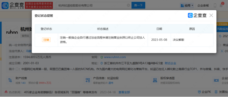 據(jù)企查查APP顯示,杭州如涵控股股份有限公司工商經(jīng)營狀態(tài)由存續(xù)變更為注銷。從一時風(fēng)光無二的網(wǎng)紅電商第一股,到現(xiàn)在疑似注銷。當(dāng)然了,具體情況如何我們或許還應(yīng)該靜待官方消息,只不過如涵從上市到退市的遭遇已經(jīng)足以令人感到唏噓了。