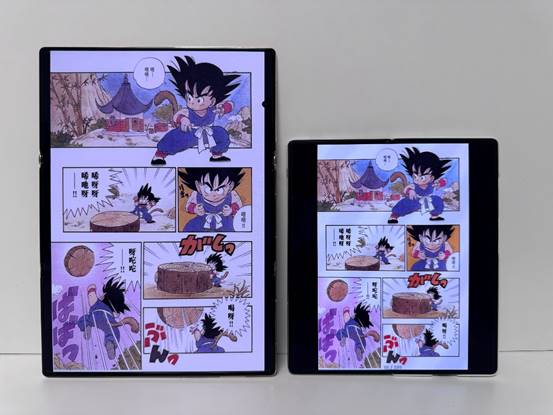 10.2英寸的屏幕大小相較于普通手機,提供了巨大的可視面積,足以清晰展示報刊的復雜版面和漫畫的精細畫格,大多數漫畫單頁可以完整顯示,不需要分屏查看。跨頁畫面可以完整呈現,保持了畫面的沖擊力和敘事連貫性;而相較于更大尺寸的平板電腦,它又通過折疊設計保持了出色的便攜性,可以輕松放入口袋,實現了閱讀場景的自由切換。無論是通勤途中短暫瀏覽新聞,還是在家中深度閱讀漫畫章節,它都能勝任。同時,類紙質顯示技術也讓閱讀體驗更為舒適。京東方OLED屏幕采用特殊紋理技術,在專業閱讀模式下可模擬紙張的漫反射效果,有效減少長時間閱讀的視覺疲勞。