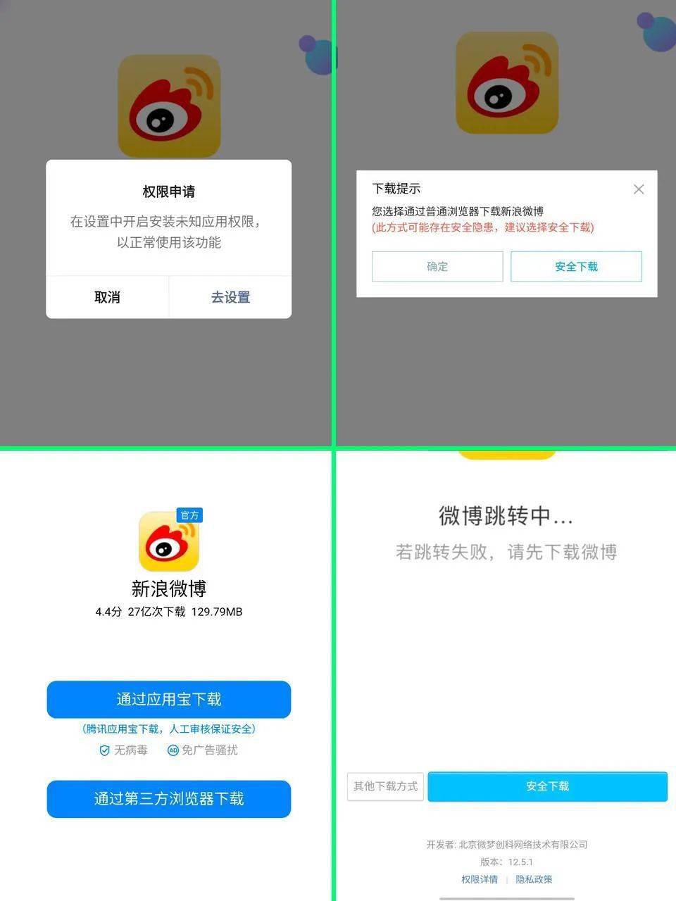 點了其它下載,它依然會一個提示,建議你選擇安全下載。你依然點擊普通下載,它才會在微信自帶的瀏覽器內核給你下載 APP,然后 vivo 應用商店又站出來再來一輪 “ 權限 ”問候。。
