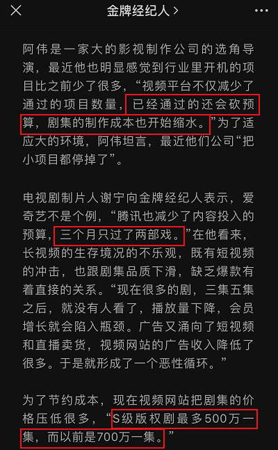 不止是愛奇藝,隔壁騰訊三個(gè)月也只過了兩部劇,劇集的價(jià)格也被壓低, S 級(jí)別的版權(quán)劇以前是 700 萬一集,現(xiàn)在是 500 萬。