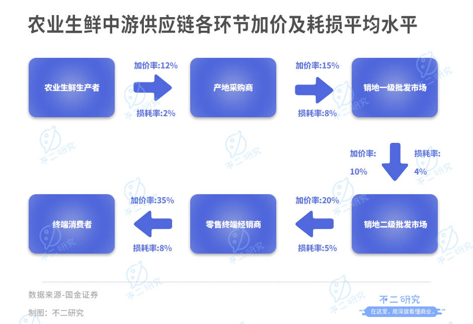 據(jù)國金證券研報顯示,從產(chǎn)品屬性角度看,水果為非標(biāo)準(zhǔn)產(chǎn)品,種植端和零售端均較為分散,從果園到零售商可分為采摘、分選、包裝、保鮮、儲存、運(yùn)輸?shù)榷嗟莱绦颍掖蟛糠址咒N商僅能覆蓋一部分程序。因此形成了冗長、高度分散且涉及眾多中間商的行業(yè)痛點(diǎn),漫長的分銷過程不可避免地導(dǎo)致了高損耗率和受限的運(yùn)輸半徑。