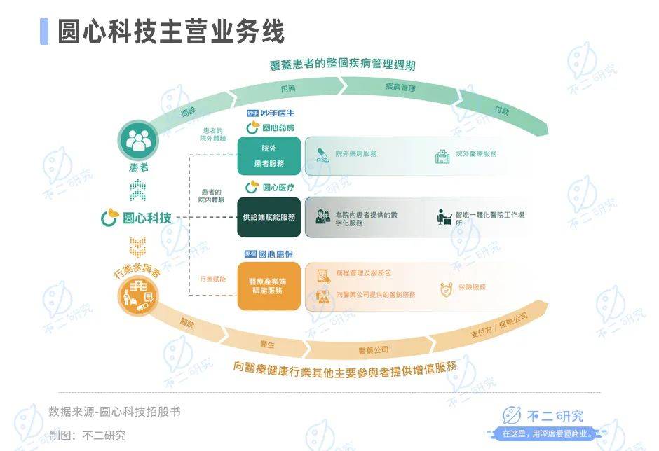 創(chuàng)業(yè)至今,圓心科技主要有三條業(yè)務(wù)線,即:院外綜合患者服務(wù),旗下?lián)碛小懊钍轴t(yī)生” “圓心藥房”兩個平臺;供給端賦能服務(wù),對應(yīng)“圓心醫(yī)療”;創(chuàng)新醫(yī)療健康服務(wù),主要包括“圓心惠保”等。