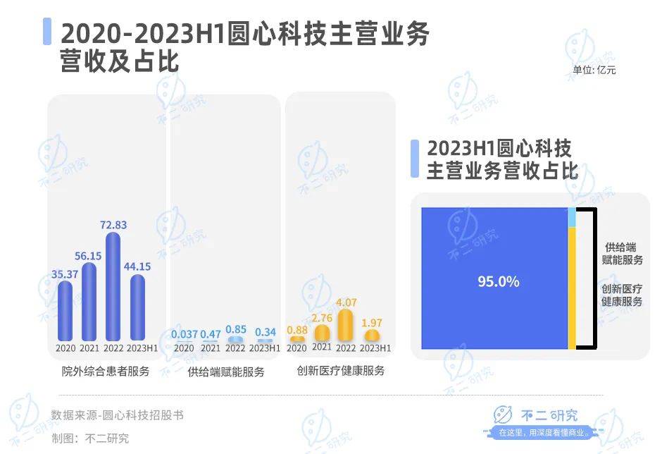 同期,圓心科技院外綜合患者服務(wù)的營收為44.15億元,當(dāng)期營收占比為95.0%。