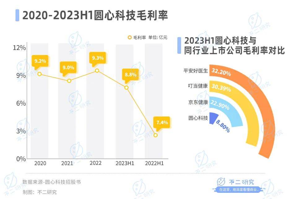 對比互聯(lián)網(wǎng)醫(yī)療行業(yè)的部分公司,圓心科技的毛利率處于行業(yè)低位:以2023年上半年為例,平安好醫(yī)生毛利率為32.20%、京東健康毛利率為22.9%,叮當(dāng)健康的毛利率則高達(dá)30.39%。