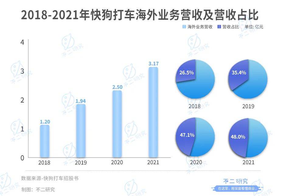 據快狗打車招股書顯示,其海外業務業績增速十分亮眼。2018年-2021年,GOGOX營收分別是1.2億元、1.94億元和2.5億元,3.17億元,復合增長率達到了50%。按營收的地域來劃分,2020年公司更是有48.0%的收入都來自于海外。