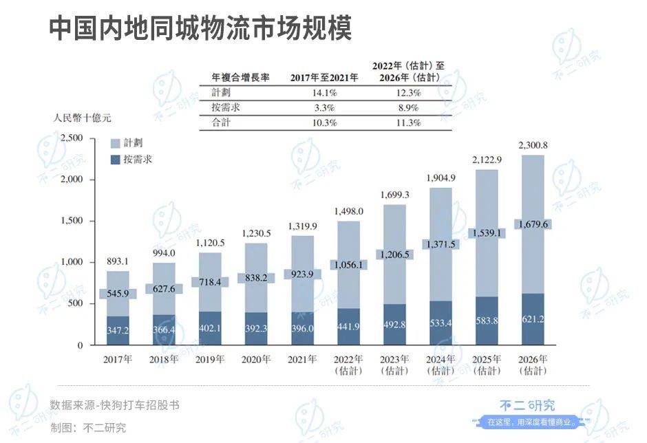 據弗若斯特沙利文報告顯示,2021年中國內地同城物流市場規模達1.32萬億元,預計2025年達到2.12億元,2021-2026年復合增長率將達11.3%。而2021年中國內地線上同城物流滲透率僅為2.9%,市場空間大。