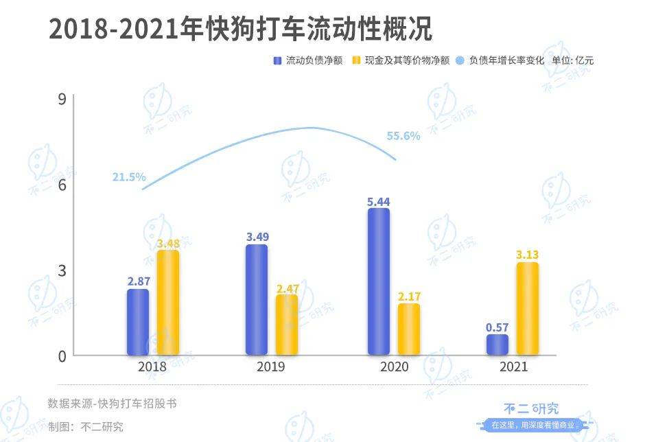 據招股書顯示,2018-2021年快狗打車流動負債凈額分別為2.87億元,3.49億元,5.44億元,0.57億元,2018-2020年,三年間其流動負債年增長率從21.5%增長至55.6%。截至2021年12月31日,流動負債凈額為0.57億元。