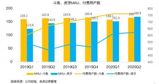 對比2020年Q1季度的數據,在用戶層面,虎牙的MAU為1.51億,而斗魚的MAU為1.581億,到了Q2,虎牙平均MAU增至1.685億,較斗魚的1.65億,也只拉開三百多萬的微弱優勢。