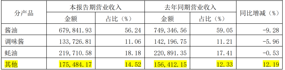這一現象我們能在今年已披露的半年度業績報告中窺見一二。數據顯示,海天味業在“其他調味品”的綜合營收為17.55億元,占總營收比重僅為14.52%,并沒有跑出足以支撐業績的第二增長曲線。