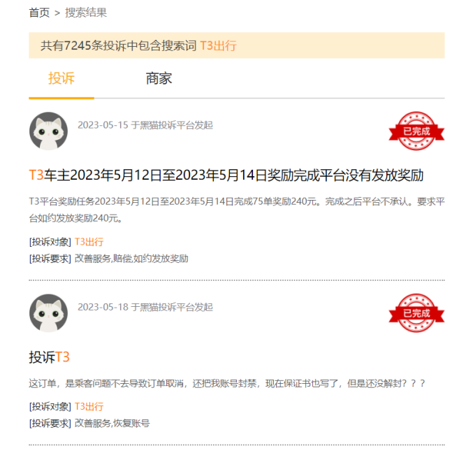 用戶的隱憂也在日漸加深,服務質量問題已成為懸在T3出行頭上的“達摩克利斯之劍”。在黑貓投訴以“T3出行”為關鍵詞搜索,可以發現7245條結果,眾多投訴指責T3出行的司機亂收費、惡意繞路、不接乘客。