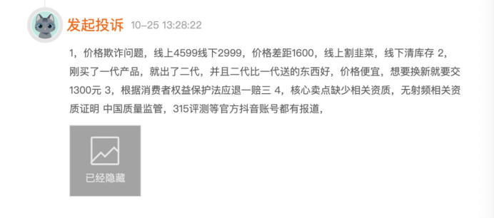 就如AMIRO覓光膠原炮的渠道差價,已經有消費者在黑貓投訴平臺發起投訴維權。