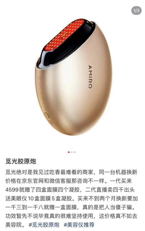 還是拿AMIRO覓光第一代膠原炮這款產品來看,盡管官方在主流電商平臺的價格不大,貴得統一,但有用戶早就在小紅書吐槽,二代比一代更便宜、贈品更多,且一代機器想要換新,價格在京東和在微信小程序還不一樣。