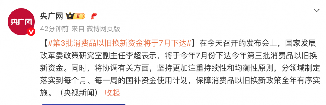 第三批消費品以舊換新資金將于7月下達