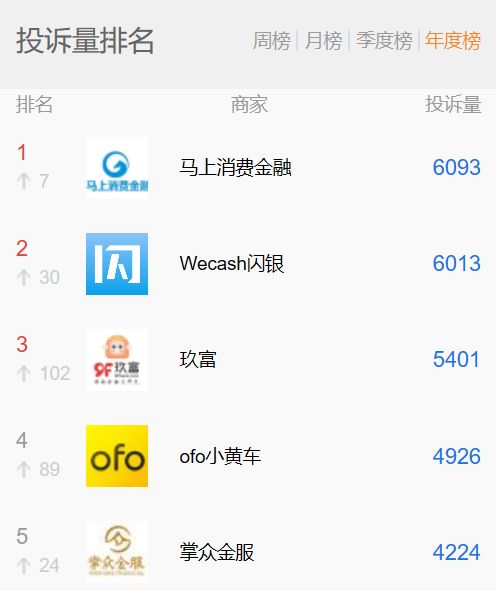 目前在聚投訴年度榜單上馬上消費(fèi)金融以微弱優(yōu)勢占據(jù)第一,閃銀和玖富分居第二和第三位,都領(lǐng)先于已經(jīng)資金鏈斷裂的小黃車ofo。