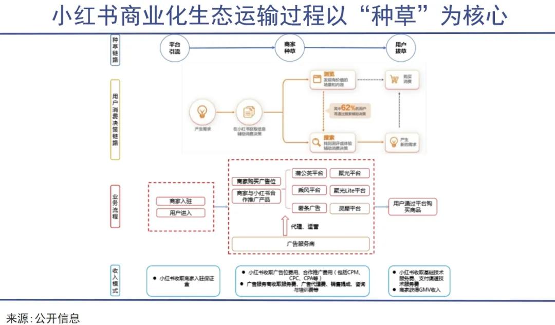 在用戶“拔草”環節,用戶通過平臺購買商品,商家獲得GMV收入,小紅書則按比例收取基礎技術服務費和支付渠道技術服務費。通過這套“種草-拔草”的循環,小紅書通過廣告、電商兩種模式將流量變現,從而打通商業化生態。