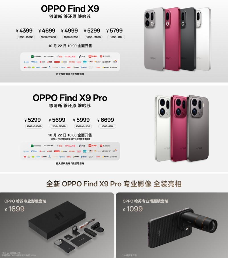 作為 OPPO 30 周年巨獻之作,Find X9 系列以畫質革命徹底重構影像體驗,用全面進化的性能、續航、護眼好屏與更流暢更智慧的系統,精準解決用戶核心痛點,強勢打造新一代旅拍神器。Find X9 系列 4399 元起售,10 月 22 日正式開售;Find X9 Pro 衛星通信版 11 月開售,并將率先支持 eSIM。OPPO與哈蘇聯合打造的哈蘇專業影像套裝售價 1699 元。