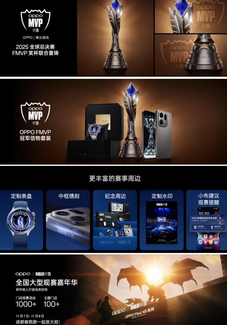 OPPO Find X9 系列更成為 2025 英雄聯盟全球總決賽賽場影像官方用機。OPPO 作為 2025英雄聯盟全球總決賽(S15)全球合作伙伴,與拳頭游戲雙方聯合重鑄 FMVP 獎杯,并為冠軍選手定制全球限量手表。同時用戶可享賽事定制表盤、免費個性化鐫刻服務及 S 賽專屬 OS 體驗(定制水印、觀賽提醒等)。