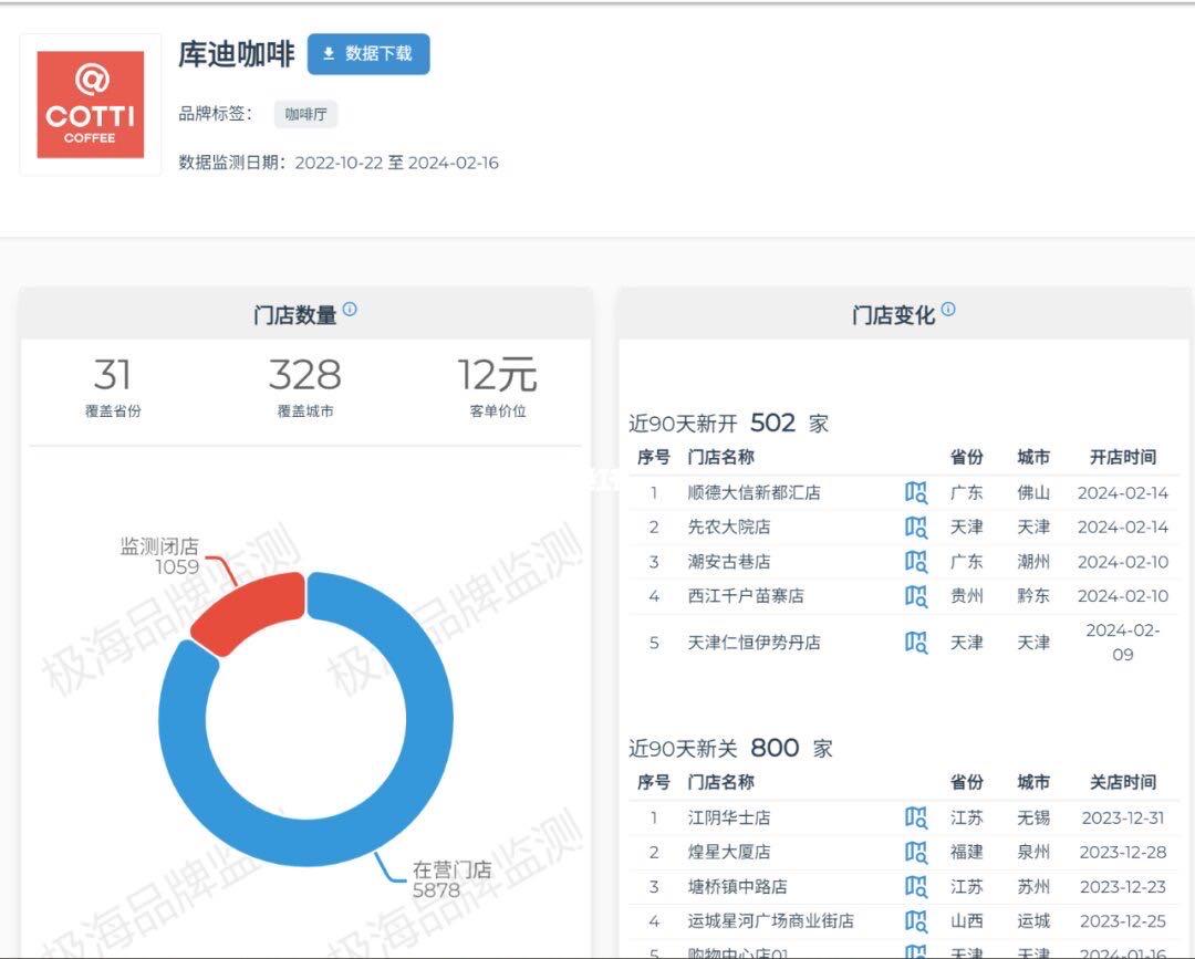 有不少媒體報道過,庫迪的杯量已經嚴重下滑至平均日杯量僅有155杯左右。沒有杯量,聯營商也難以支撐,閉店大潮正在上演。極海品牌監測統計的數據更是顯示,過去90天里,庫迪關閉門店達826家,在營門店數量已跌破6000家。
