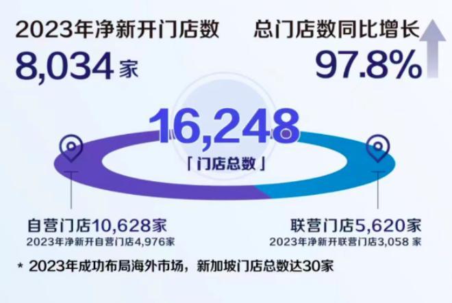 截至2023年,瑞幸在中國總計已擁有門店16218家,其中,凈增加門店數量為8034家。業內預測,2024年,瑞幸咖啡門店數將突破2萬家。