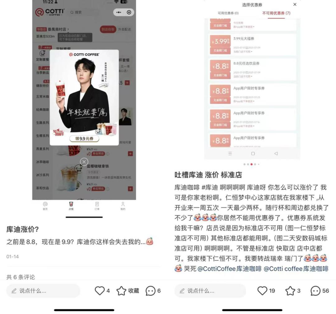 即便只算庫迪此前幾乎7.5一杯的價格漲到9.9元,實際漲幅也已經超過了30%。但當庫迪與瑞幸同樣都賣9.9元的時候,不僅消費者吐槽連連,就連庫迪聯營商都無奈感嘆“品牌不行,跟瑞幸沒法比”。