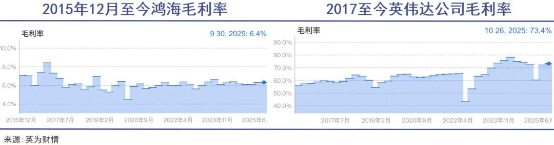 而蘋果最新財(cái)季(2025財(cái)年Q4)毛利率為47.2%,硬件毛利率36.2%,整體的凈利率為26.8%。也就是說(shuō),鴻海在引以為傲的AI業(yè)務(wù)取得突破性發(fā)展后,其收入規(guī)模擴(kuò)大,資本市場(chǎng)估值大幅提升,但盈利能力的提升遠(yuǎn)不如收入和估值的提升。