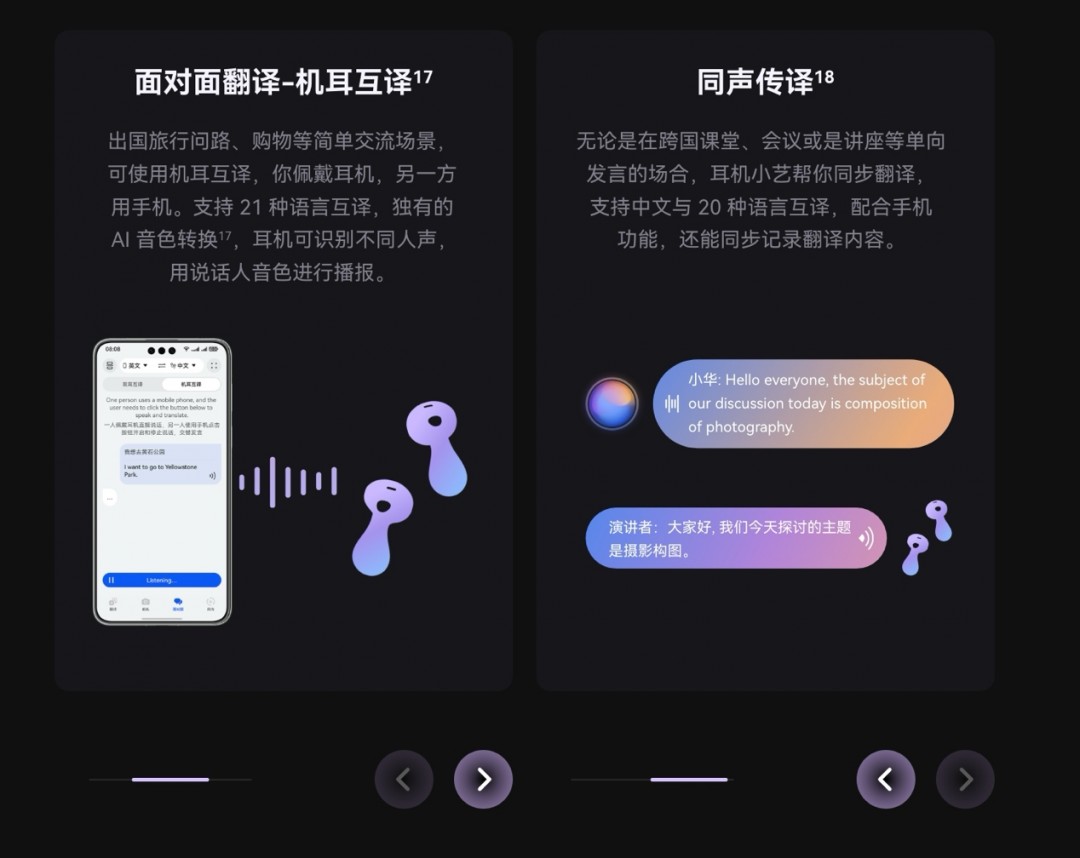 在全球化的今天,跨語(yǔ)言交流變得越來(lái)越頻繁。華為FreeBuds 6玫瑰金在面對(duì)面翻譯功能上進(jìn)行了重大升級(jí),新增了雙耳互譯功能。以往的機(jī)耳互譯模式,需要一人佩戴耳機(jī)說(shuō)話,另一人看手機(jī)的翻譯文字并借助手機(jī)拾音進(jìn)行翻譯,而現(xiàn)在的雙耳互譯功能則更加便捷高效。