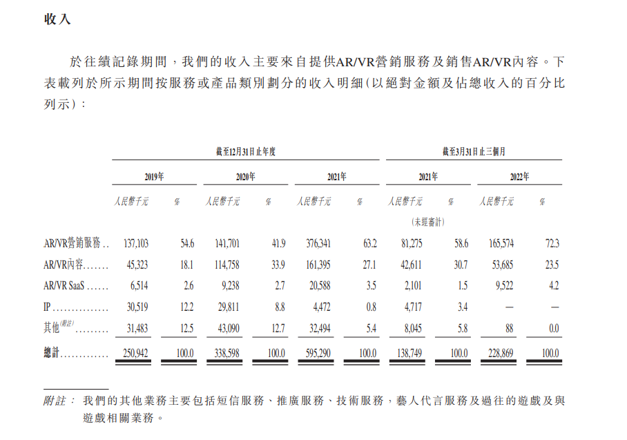 其中營銷服務為主要服務,它是基于AR/VR互動內容向廣告客戶提供AR/VR營銷服務。說白了,就是用VR/AR的形式做的廣告,然后我再幫你找到投放渠道。