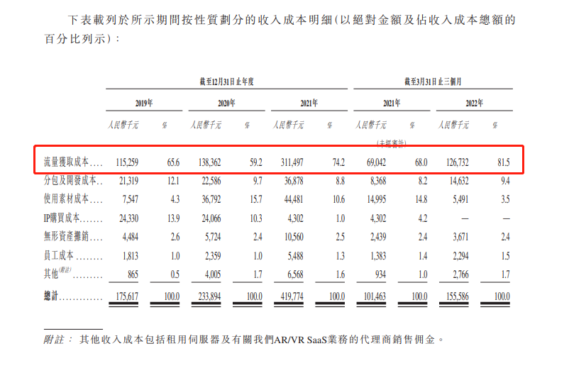 而且飛天云動的成本也持續增長,2019年至2022年一季度,飛天云動購買廣告支出的流量獲取成本分別為1.15億元、1.38億元、3.11億元和1.27億元,占總成本比重分別高達65.6%、59.2%、74.2%和81.5%。