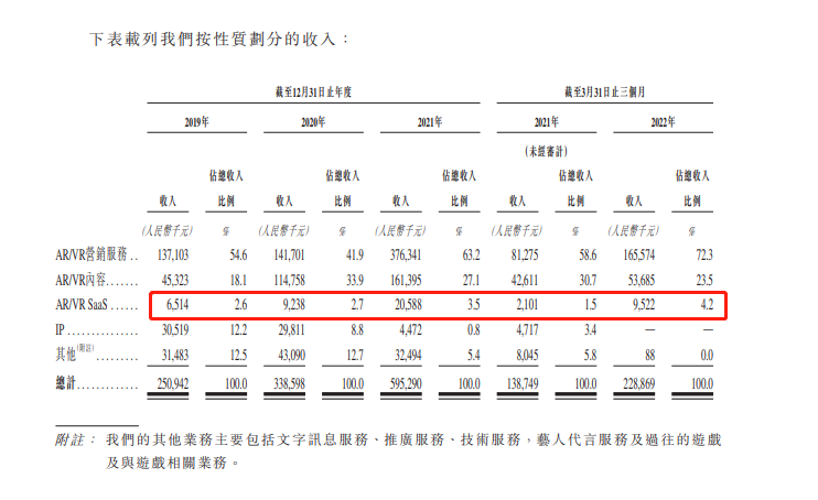 目前飛天云動的VR/ARSaaS業務收入在總營收的占比僅是個位數,其2019年、2020年、2021年及2022Q1,收入分別為,651萬、923萬、2058萬、952萬,占比為2.6%、2.7%、3.5%、4.2%。