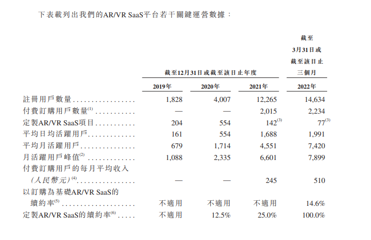 而近兩年開始發力的AR/VRSaaS則是開放自研開發的低代碼平臺,主要為客戶定制AR/VR SaaS解決方案客戶及服務AR/VR SaaS平臺付費訂購用戶。
