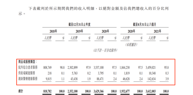 得益于豐富的藥品種類和消費者便捷周到的購買體驗,院外綜合患者服務一直是圓心的“現(xiàn)金奶?!睒I(yè)務。在牢牢占據(jù)創(chuàng)收主力位置的同時,依然能保持自身體量的飛速增加,收入從2018年的8.09億元猛增至2020年的35.37億元;在2021年的前八個月中達到34.59億元,本年也有望再創(chuàng)新高。
