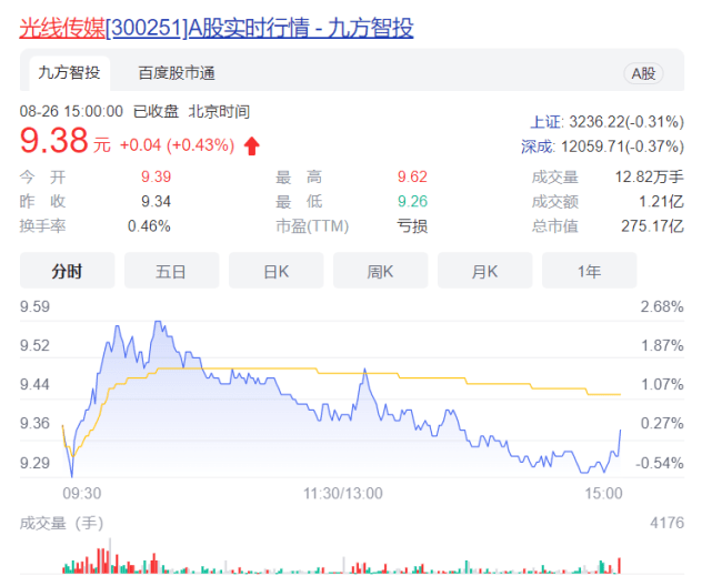 截至今日收盤,光線傳媒股價報9.38元/股,上漲0.43%,總市值275.17億元。